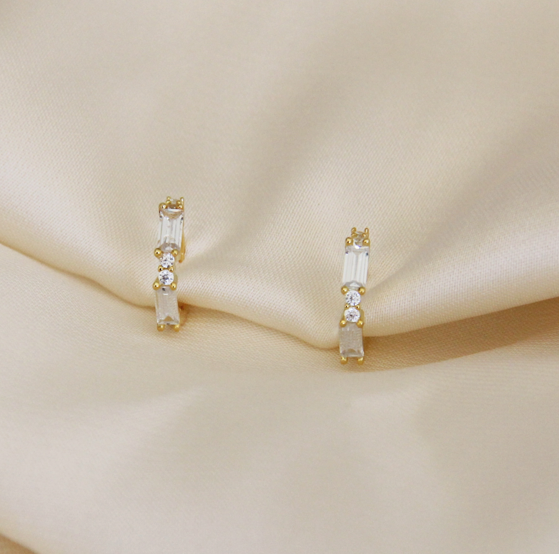 Our Aurora hoops, featuring dainty hinged hoops with baguette and round CZ detail. Perfect for every day and layering