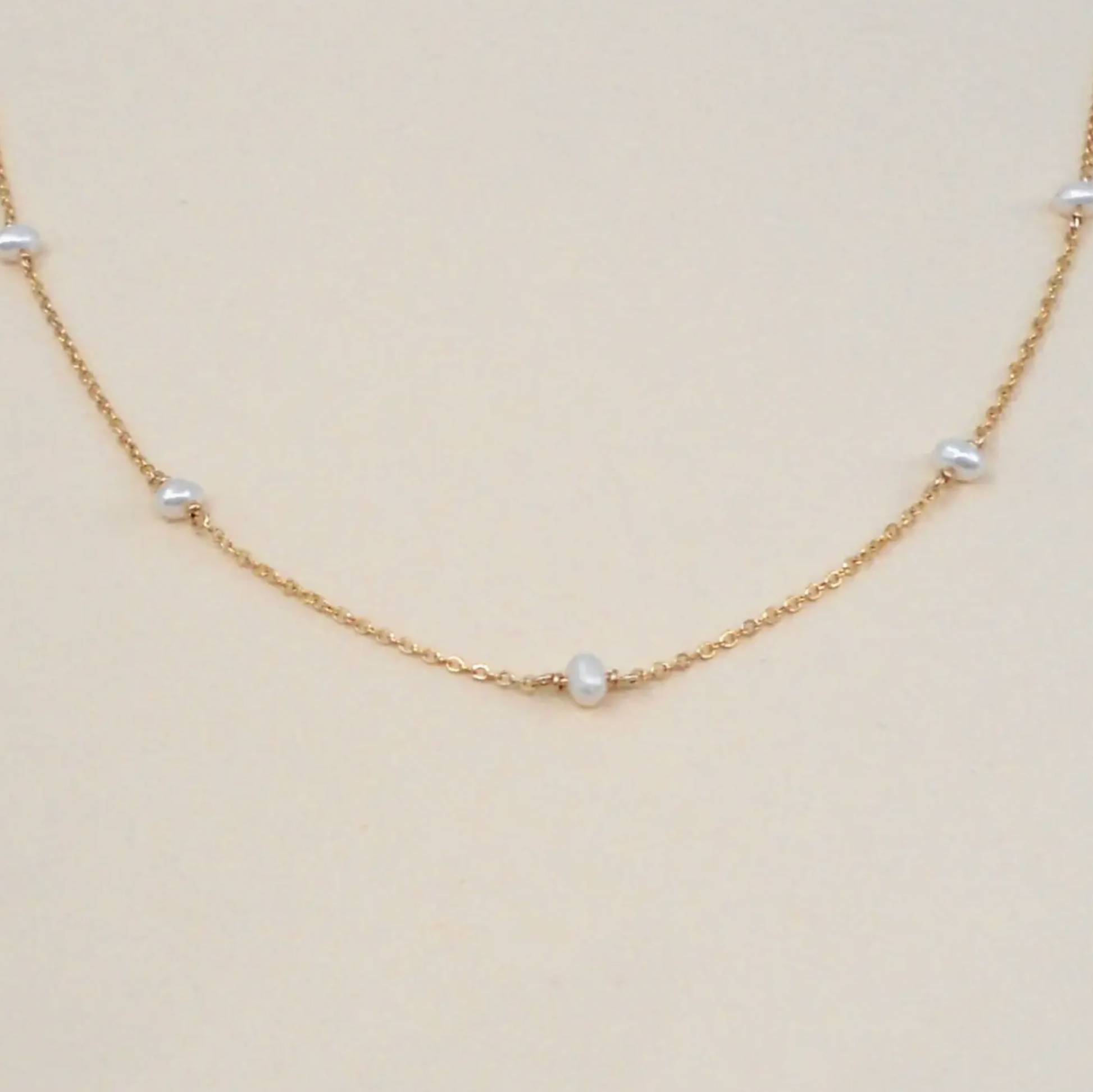Material: Gold filled Length: 13.5" chain with a 1.5" extender Charm: Fresh water pearls *Size and shape of pearls may vary Made by hand in Southern California