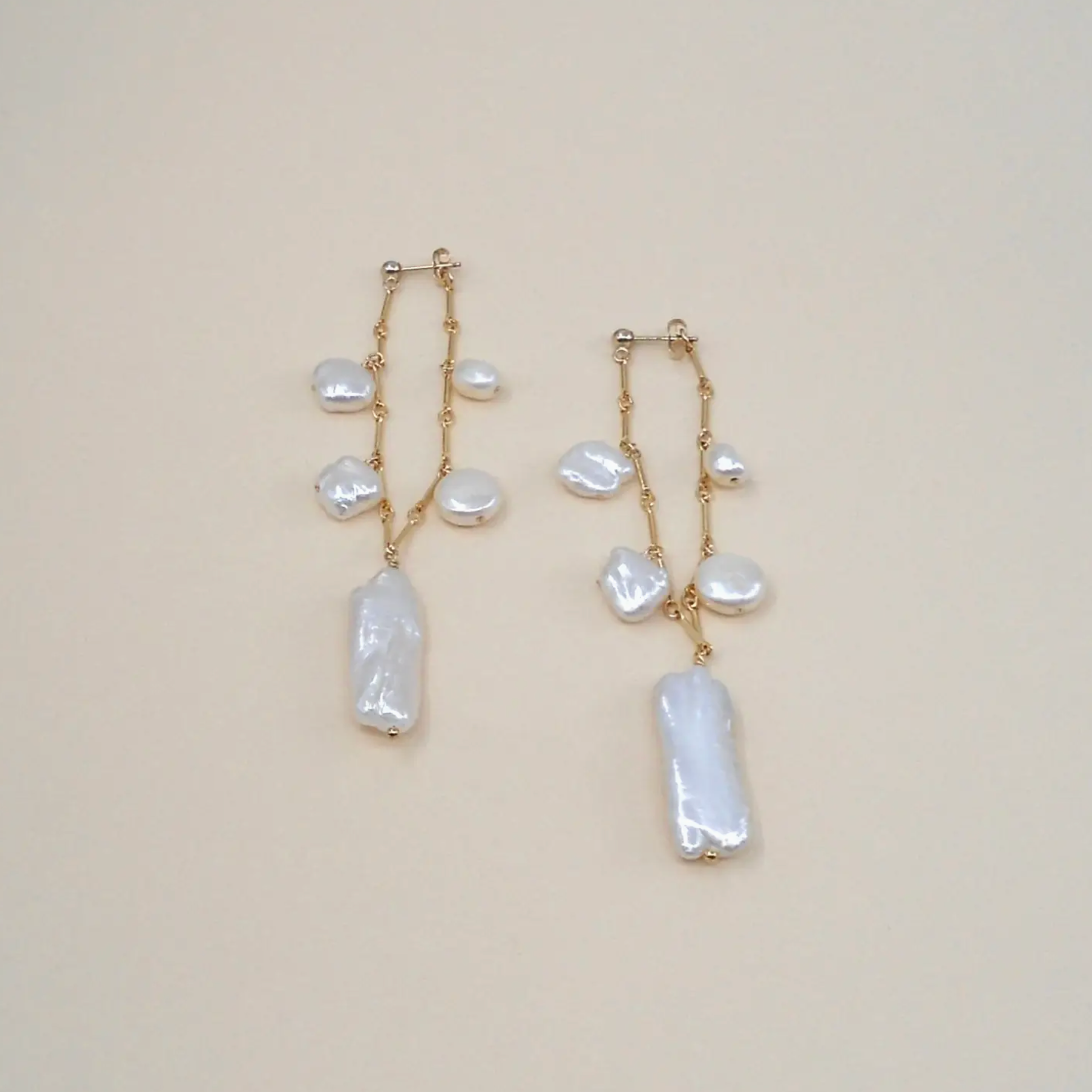 Material: Gold filled stud and chain, freshwater pearls Length: 3" total length *Size and shape of pearls may vary Made by hand in Southern California
