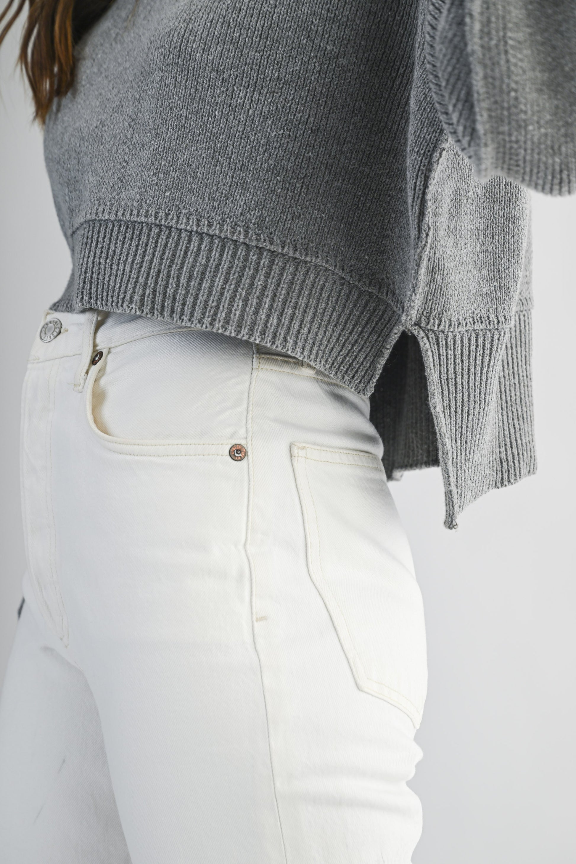 Solid knit mock neck long sleeve pullover mineral wash look crop sweater top.