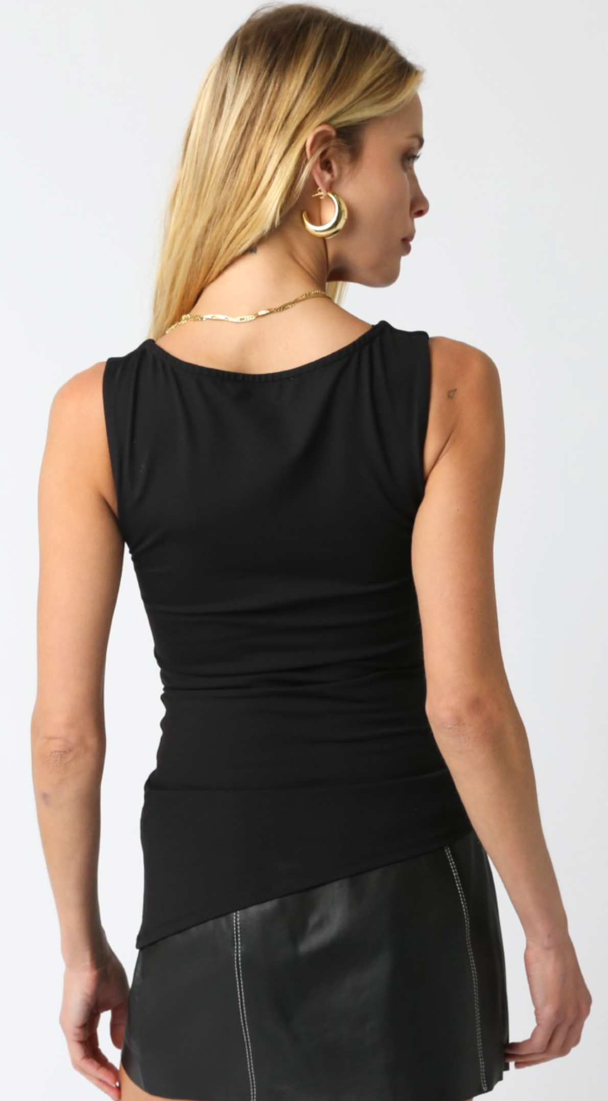 The Jay Tank Top is a sleek, sleeveless design featuring a modern asymmetrical hem for a flattering silhouette. Made from soft, stretchy fabric, it's perfect for dressing up or down.