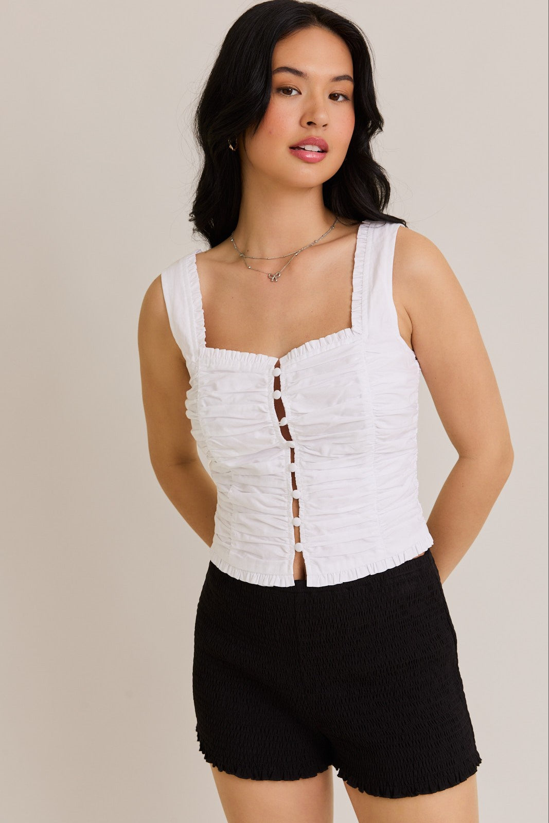 The Kula Top is a fitted tank featuring ruched detailing and a flattering square neckline. Its front button accents and wide straps give it a structured yet feminine vibe. Perfect for summer days or layering under a jacket for an elevated casual look.