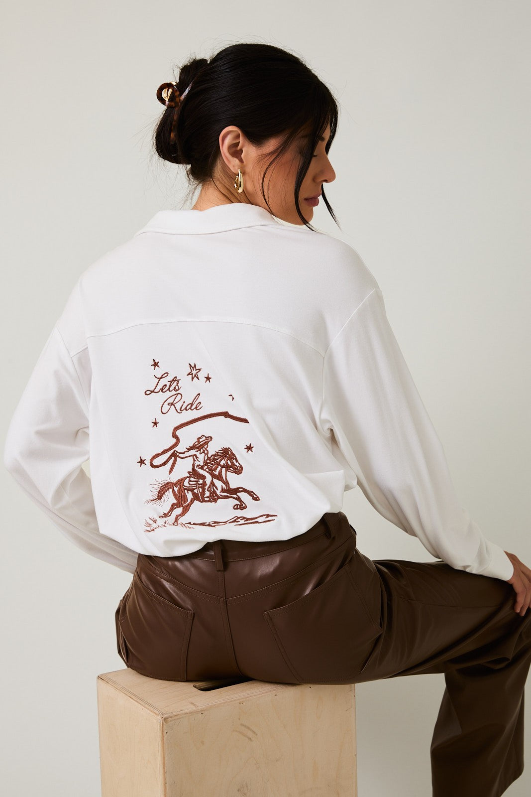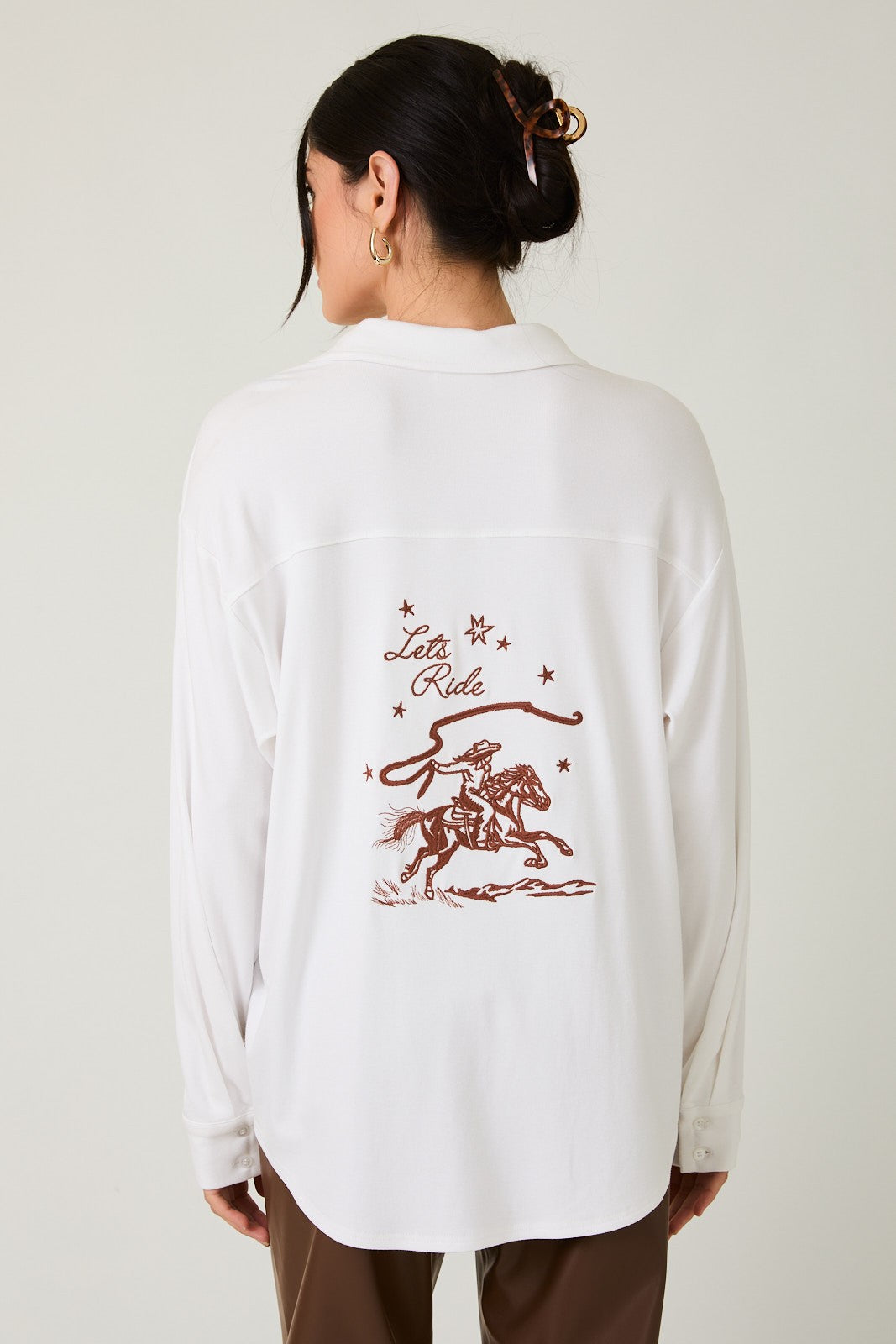 Lets ride soft cotton button down. This top is made with a buttery soft fabric with the most adorable western touches