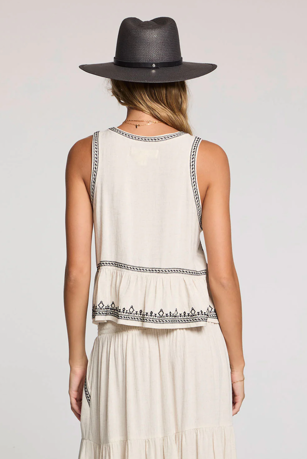Its full and flowy natural hued body is adorned with petite black Moroccan-inspired detailing adds a touch of luxury.